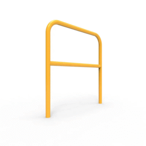 Galvanised and powder-coated U-bar double rail with retractable strap for vehicle and pedestrian protection.